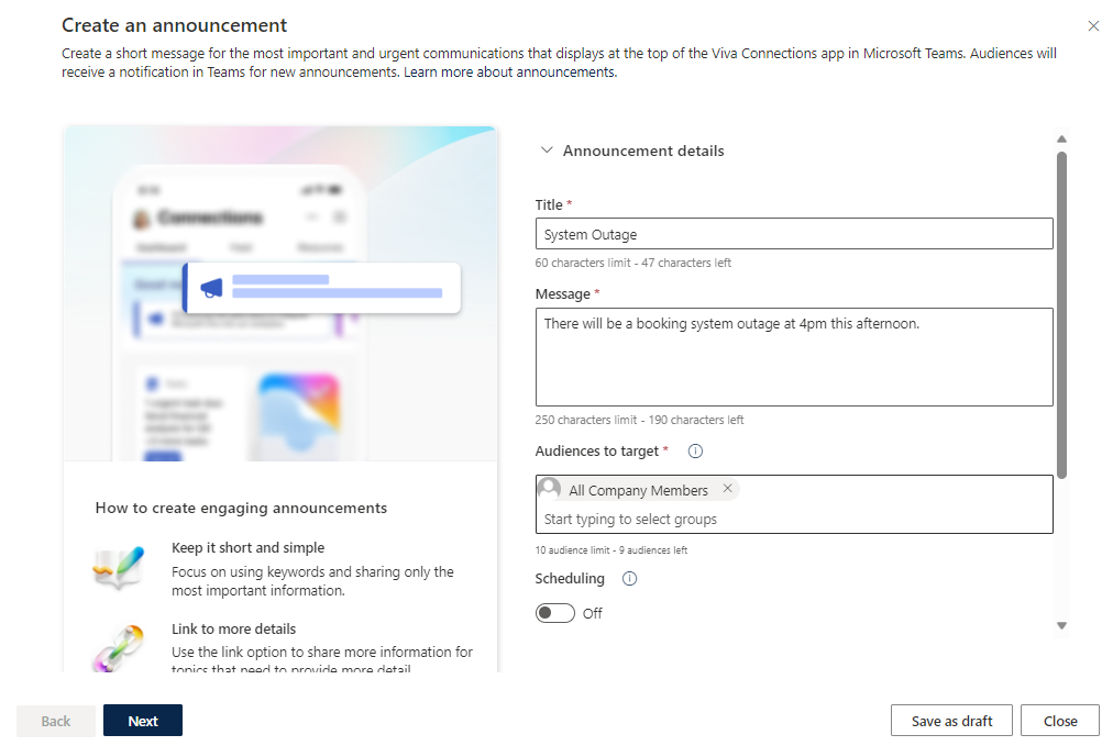 - Target your announcements to specific audiences. You can target announcements to specific departments, teams, or even individuals. This ensures that your employees are only seeing the information that is relevant to them.