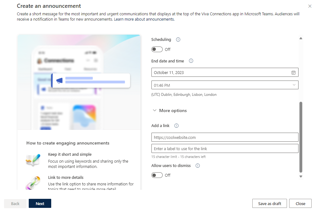 Here are a few tips for using the new Announcements feature in Viva Connections effectively: